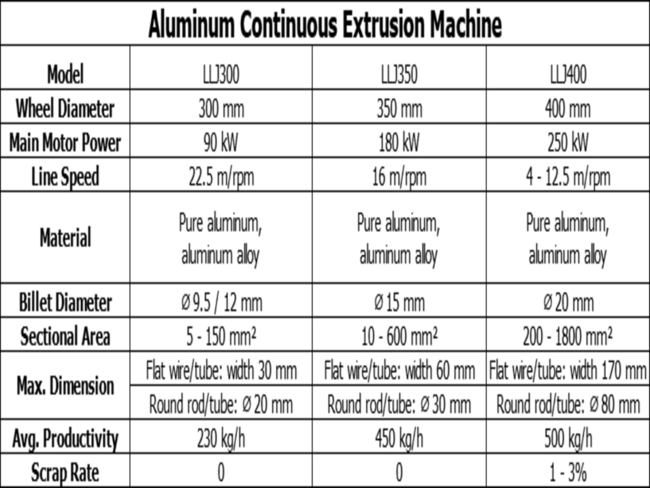 Máquina de extrusión continua de aluminio 300 I. Introducción Modo de extrusión: Extrusión continua en dirección radial mediante rueda única y ranura única Solicitud: Aluminio macizo y hueco. Materia prima: Varilla de aluminio de Ø 9,5 mm. II....